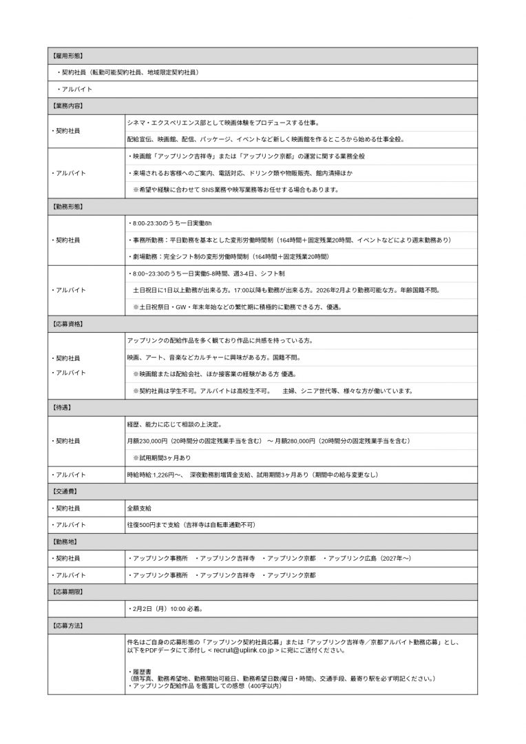 件名はご自身の応募形態の「アップリンク契約社員応募」または「アップリンク吉祥寺/京都アルバイト勤務応募」とし、
