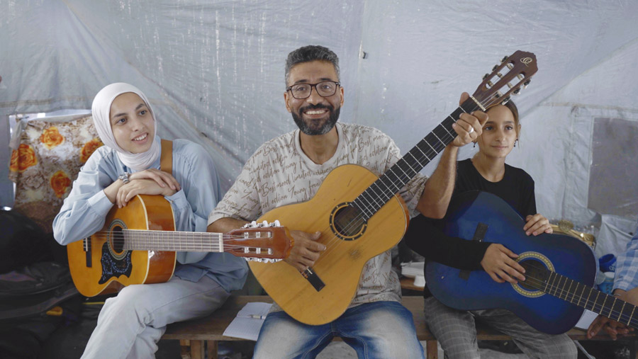 撮影場所: 無名戦士公園 避難民キャンプミュージシャンのアハマド・アブ=アムシャはガザの無名戦士公園の難民キャンプで避難生活を余儀なくされている。爆撃、食糧不足にもめげず、キャンプ生活の中で子どもたちに音楽を教えている。